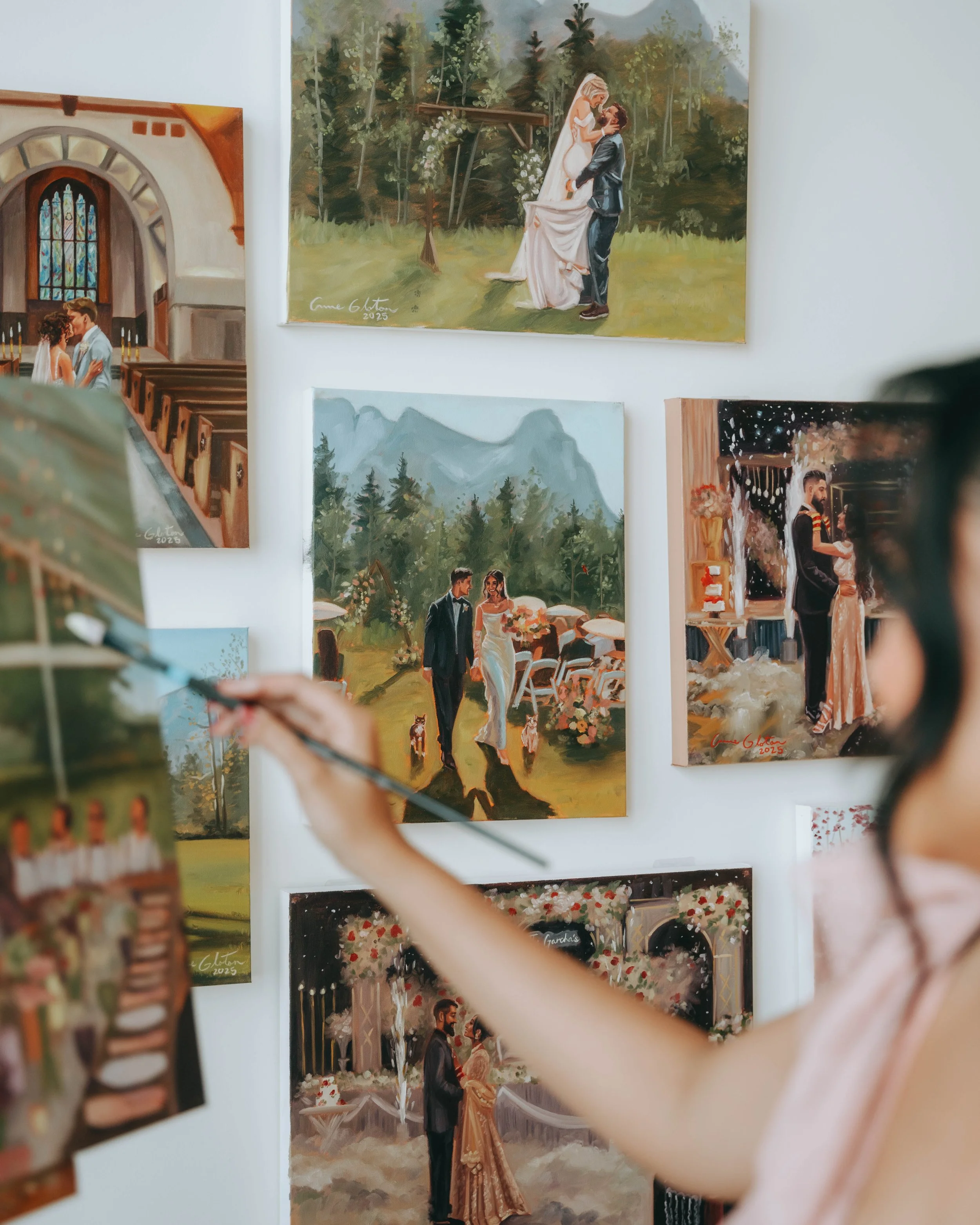 I aim to finish the majority of the painting during the event, allowing your guests to enjoy the creative process. After the wedding, the final details are added in my studio. Due to the high-quality oil paints used, the artwork requires time to fully cure before it is ready for delivery. Once the couple has approved the final piece, it is varnished for protection and professionally packaged. The estimated delivery time is 8–10 weeks, depending on how busy the wedding season is.